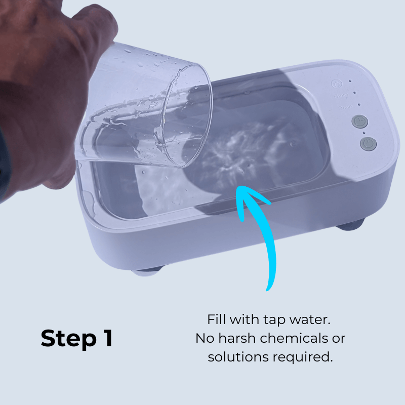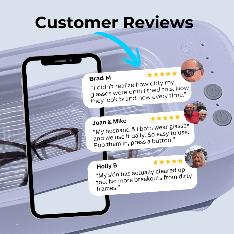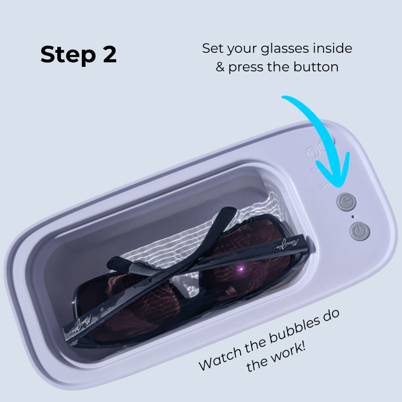 The WhistleClean glasses cleaner uses ultrasonic technology. It creates high-frequency sound waves, up to 45,000 vibrations per second, to create microscopic bubbles in water. These bubbles then rapidly pop, creating tiny pressure waves that gently lift away any dirt and grime, even from hard to reach spots your cloth can’t, like hinges and nose pads. No scrubbing, no harsh chemicals - just safe, effortless, deep cleaning.